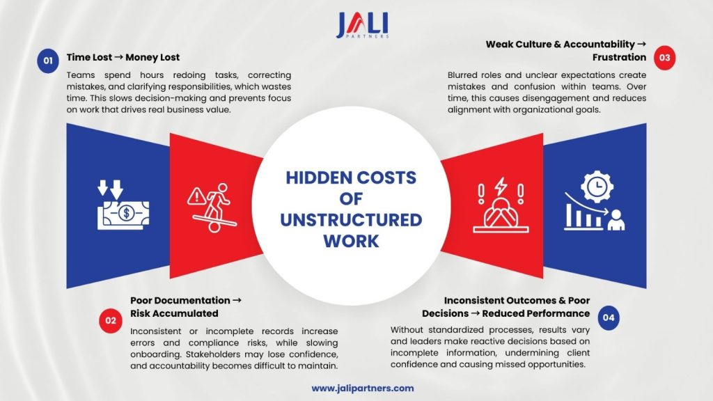 Flexibility and creativity are valued in business, but without clear structure, hidden costs accumulate quickly. Structure isn’t bureaucracy, it ensures clarity, accountability, and efficiency. Without it, teams waste time, outputs vary, and opportunities are missed. Clear processes allow resources to flow efficiently, risks to be managed, and teams to focus on high-value activities.