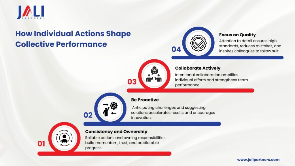 Leaders turn individual effort into organizational impact. By setting clear expectations, modeling accountability, and fostering collaboration, they ensure that personal actions align with collective goals. Leadership isn’t about control, it’s about guiding behaviors, enabling growth, and making visible the ripple effect of each contribution.